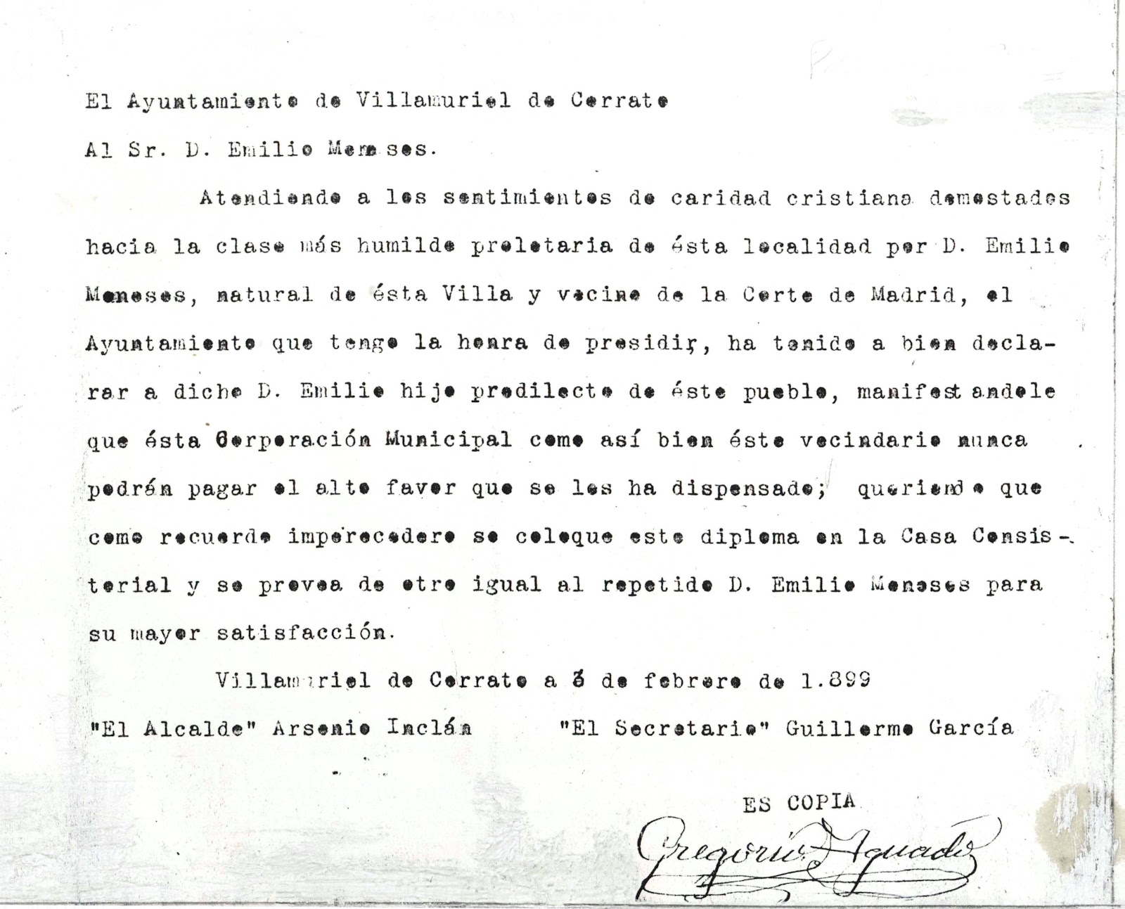 esta localidad por D. Emilio Meneses, el Ayuntamiento que tengo la honra de